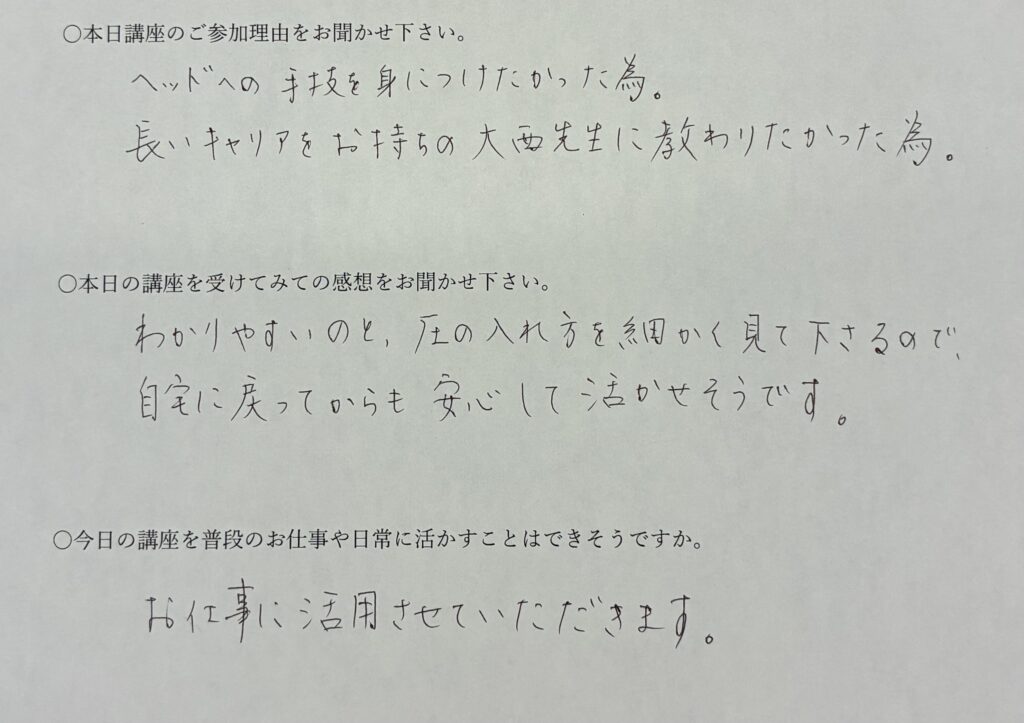 前回、足の部分の講習を受けましたが他の部位の講習も教えて頂きたかったからです。