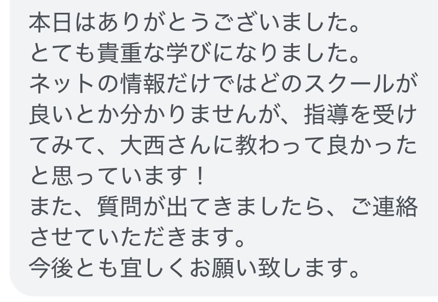 ネットの情報だけではどのスクールが良いか分かりませんが指導を受けてみて、大西さんに教わって良かったと思っています!。